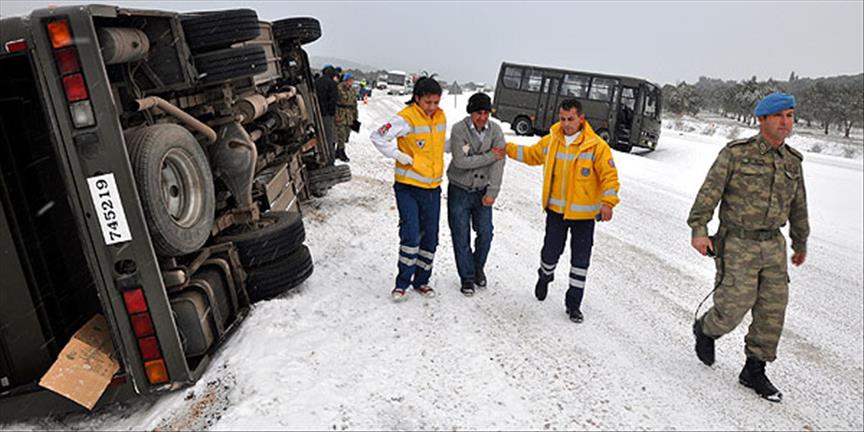 AA muhabirinin aldığı bilgiye göre, tedavi gören askerleri hastaneye götürmek üzere Kırkağaç'tan İzmir yönüne giden askeri minibüs, Kırkağaç-Akhisar sınırında kar yağışı nedeniyle kayganlaşan yolda sürücüsünün direksiyon hakimiyetini kaybetmesi üzerine devrildi.