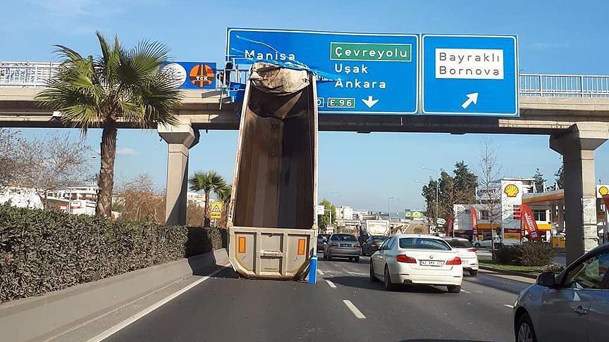 İzmir'in Bornova ilçesinde, tır dorsesi üst geçide çarptı.