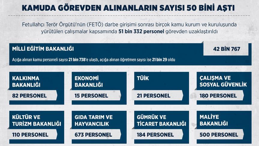 Fetullahçı Terör Örgütü'nün (FETÖ) darbe girişimi sonrası birçok kamu kurum ve kuruluşunda yürütülen çalışmalar kapsamında 51 bin 332 personel görevden uzaklaştırıldı. Çalışma ve Sosyal Güvenlik Bakanlığı başta olmak üzere ekonomiyle ilgili kurum ve kuruluşlarda ise 15 Temmuz'dan bugüne kadar toplam 5 bin 412 personel açığa alındı.