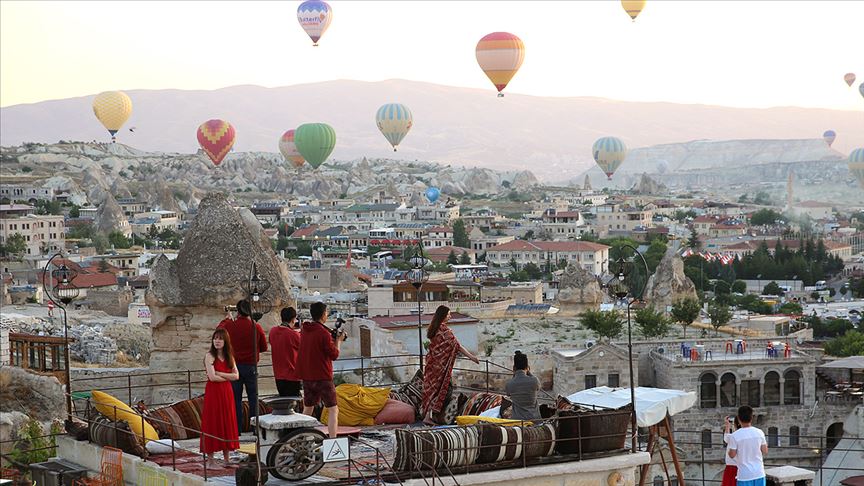 Peribacaları, doğal kaya oluşumlarıyla kaplı vadileri ile ziyaretçilerine eşsiz bir görüntü sunan Kapadokya'da otellerin terasları, sıcak hava balonlarını fonda kullanarak fotoğraf çektirmek isteyen turistlerin adeta akınına uğruyor.