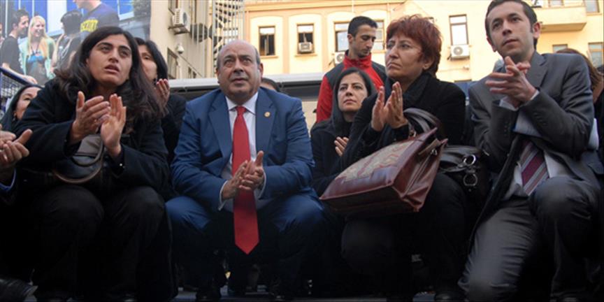 BDP Grup Başkanvekili Hasip Kaplan, TBB Başkanı Vedat Ahsen Coşar, İzmir Barosu Başkanı Sema Tektaş ve Diyarbakır Barosu Başkanı Mehmet Emin Aktar, bazı illerin baro başkanlığı temsilcileri, Beşiktaş'taki İstanbul Adliyesi önünde Terör örgütü PKK'nın şehir yapılanması KCK'ya yönelik soruşturma kapsamında 42'si avukat 46 kişinin gözaltına alınmasını protesto etti.