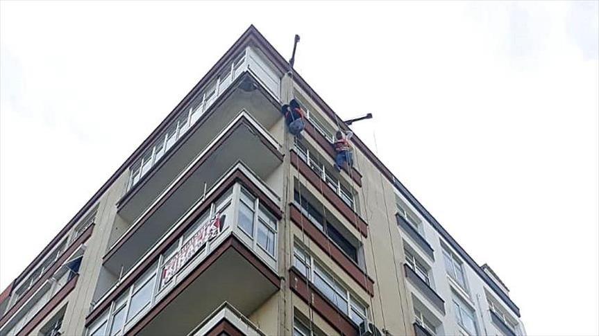 Binada iki kişinin asılı kaldığını fark eden çevredeki vatandaşların haber verdiği polis ekipleri, bölgeye gelerek apartmanın çatısına çıktı. İşçiler, tutundukları halatı yukarı çeken polisler tarafından kurtarıldı.