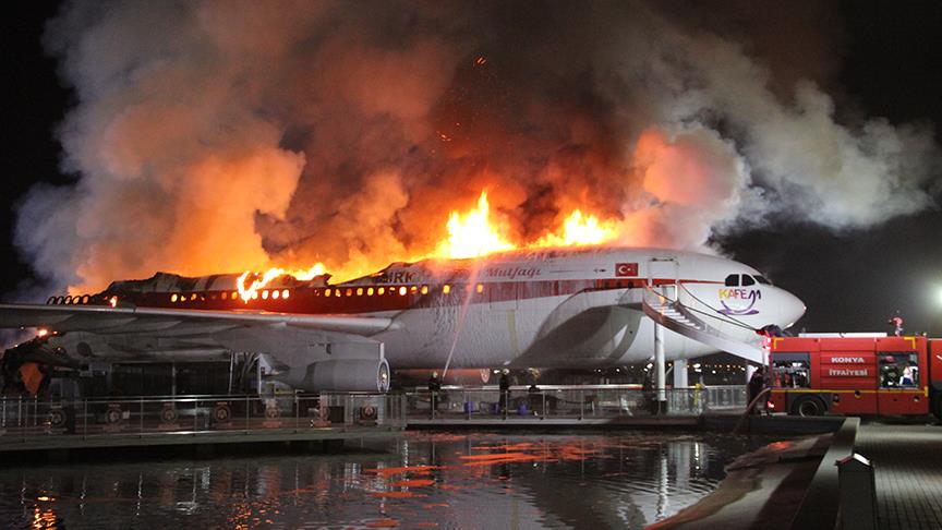 Konya'da uçuş ömrünü tamamladıktan sonra restoran ve kafeye dönüştürülen uçakta çıkan yangın, itfaiye ekiplerince güçlükle söndürüldü.