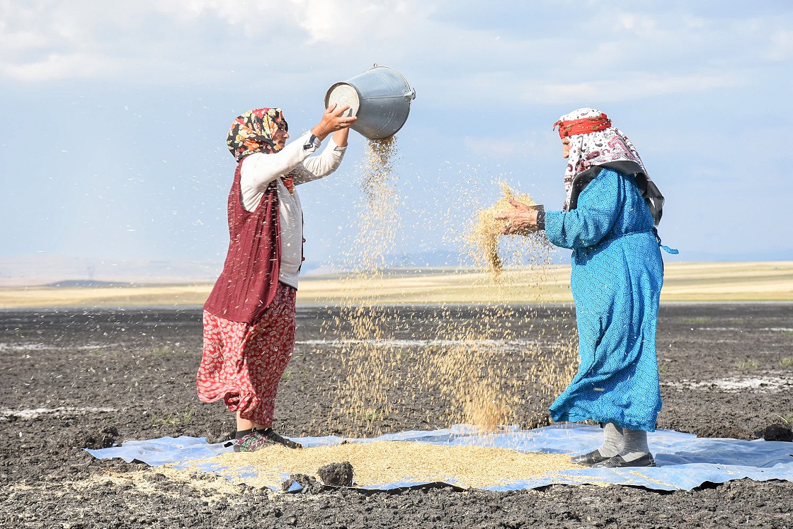 Kars'ta bazı kadınların tarım arazilerindeki hasadın ardından, kuruyan Kuyucuk Gölü'nde ürünün yabancı maddelerden ayıklanması için rüzgara karşı buğday ve arpa savurması ilginç görüntü oluşturdu.