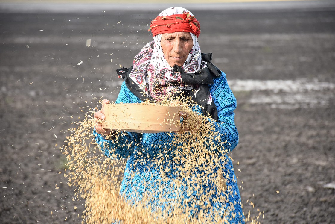 Türkiye'nin 13'üncü Ramsar Alanı olarak koruma altına alınan ancak şu sıralar tamamen kuruyan göl alanında bazı kadınların tahıl savurması ilginç görüntüler oluşturdu.