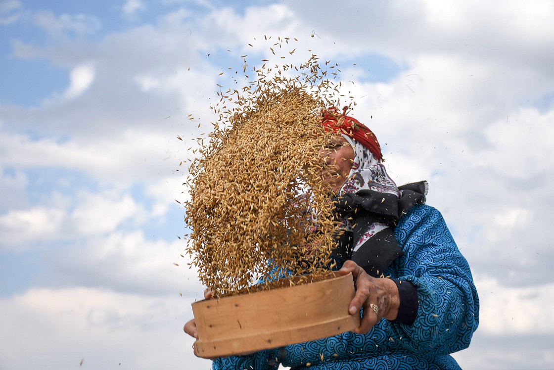 Çuvallara doldurulan tahılları rüzgarın olduğu alanlara getiren kadınlar, eleklerle savurarak kabuk ve samanlardan ayırıyor.