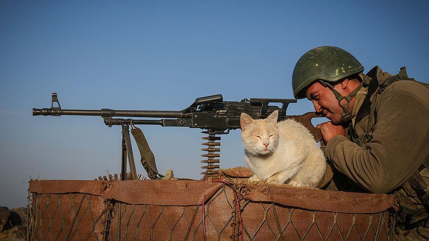 Mehmetçiğe iyice alışan hatta nöbet noktalarını tek tek gezen kediler askerlerin yanından bir an olsun ayrılmıyor.