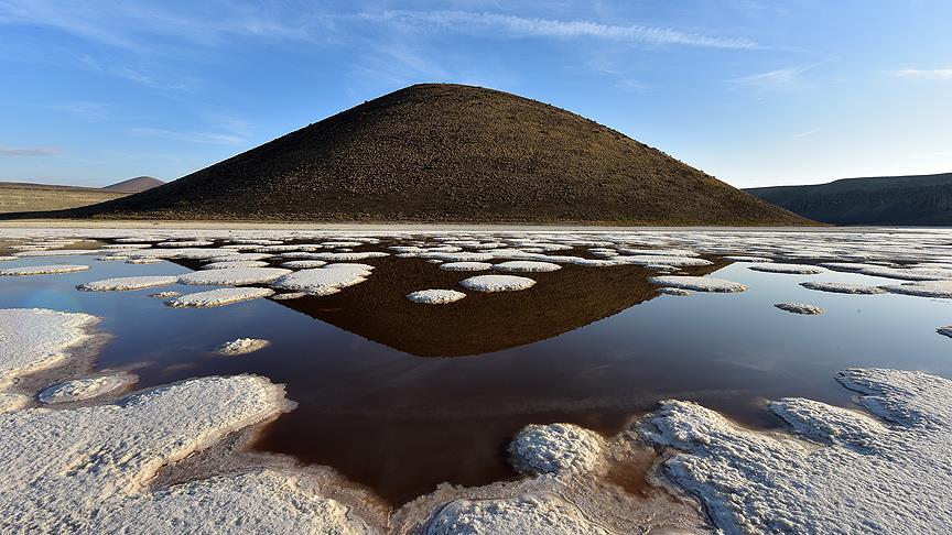 Konya'nın Karapınar ilçesinde görünümü nedeniyle "dünyanın nazar boncuğu" olarak adlandırılan Meke Gölü'nde suyun çekilmesiyle ortaya çıkan tuz adacıkları, görsel şölen sunuyor.