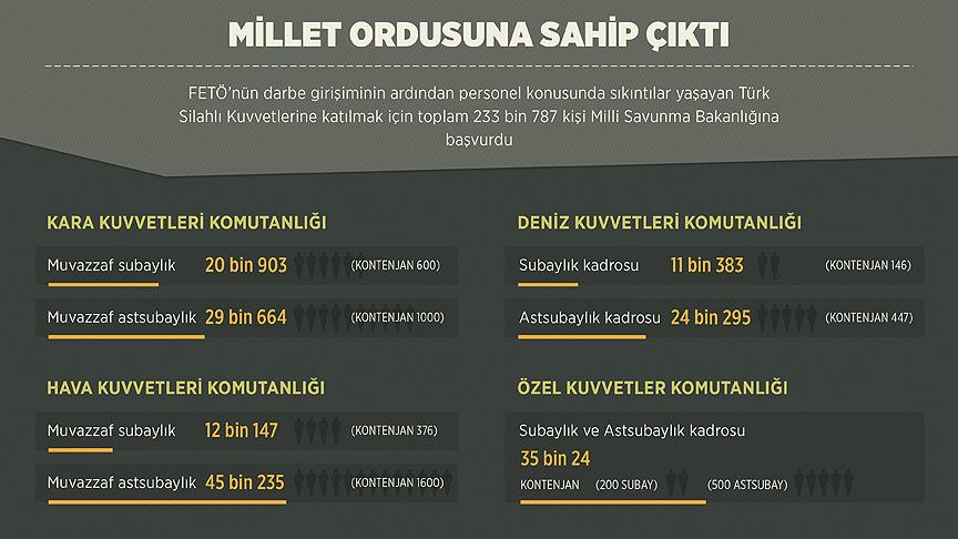 Fetullahçı Terör Örgütü'nün (FETÖ) darbe girişiminin ardından personel konusunda sıkıntılar yaşayan Türk Silahlı Kuvvetlerine katılmak için toplam 233 bin 787 kişi Milli Savunma Bakanlığına başvurdu. Vatanını ve milletini seven gençlerin yoğun başvurusundan duyduğu memnuniyeti dile getiren Milli Savunma Bakanı Fikri Işık, "Ordumuz hainlerden temizlendikçe güçleniyor" dedi.