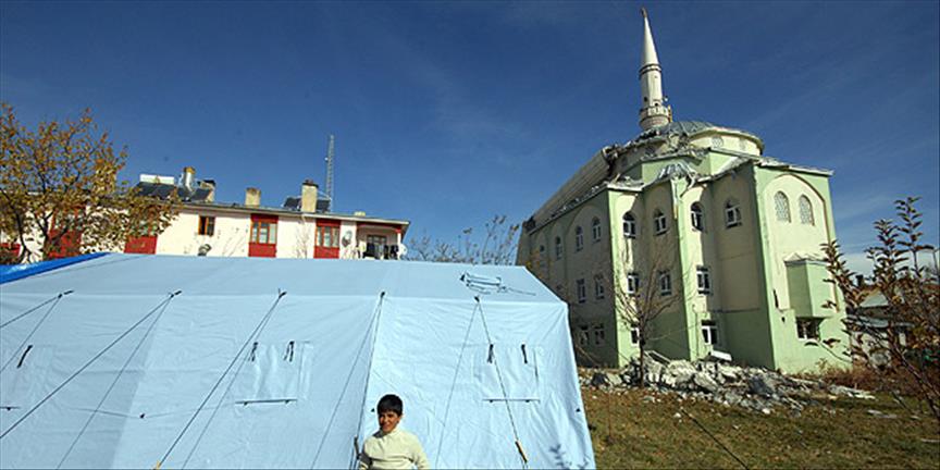 Erciş'te yaşanan 7.2 büyüklüğündeki depremde ağır hasar gören ve minareleri yıkılan camilerin bulunduğu mahallelerde yaşayan depremzedeler, özellikle yıkılan minarelerin, depremde az hasar gören evlerinin üzerine düşmesinden korktuğu için çadırlarda yaşıyor.