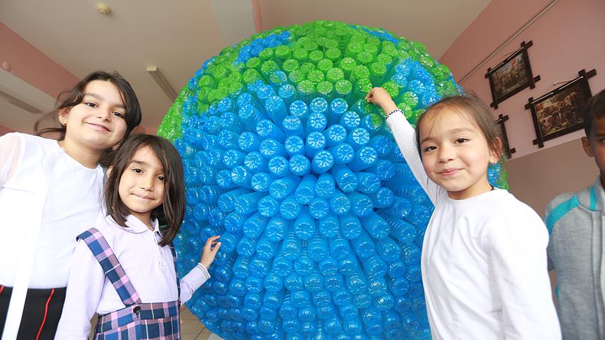 Karaman'da ilkokul öğrencileri çevre kirliliğine dikkati çekmek için hazırladıkları, "Dünya'yı geri dönüşüm kurtaracak" projesi kapsamında yaklaşık 5 bin atık pet şişe kullanarak Dünya maketi yaptı.