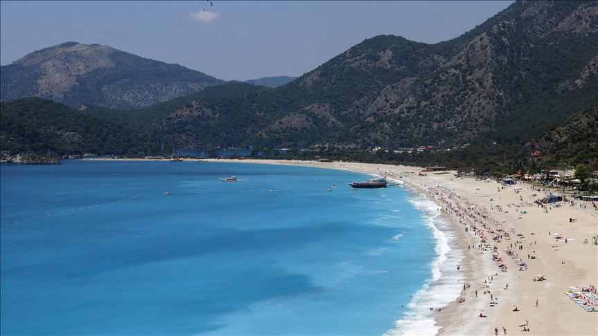 Bazı turistler, Ölüdeniz Mahallesi'ndeki Kumburnu ile Belcekız plajlarında denize girip, kumsalda güneşlendi.