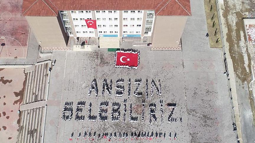 Okul bahçesinde toplanan öğrenciler, öğretmenlerinin komutlarıyla Cumhurbaşkanı Erdoğan'ın sözü olan "ansızın gelebiliriz" yazılı koreografiyi oluşturdu.