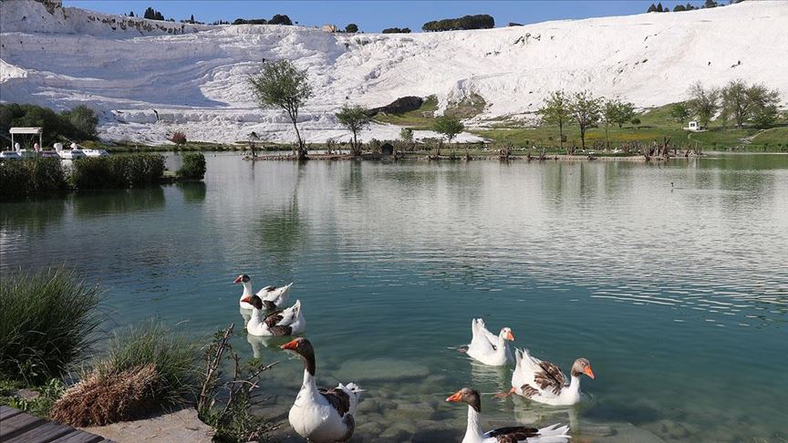 "Beyaz cennet"teki sakinliğin tadını, travertenlerin hemen altında yer alan Kocaçukur mevkisindeki gölette bulunan kaz ve ördekler ile sazlıklardaki kuşlar çıkarıyor.
