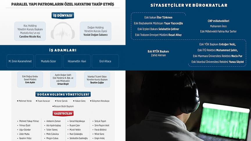 Paralel Devlet Yapılanması’nın iş dünyasını ve gazetecileri dinlediği ortaya çıktı. "Terör örgütü üyeliği, organize suç örgütü üyeliği" gibi suçlamalarla ve uydurma isimlerle dinlenen ünlüler arasında iş dünyasının önde gelen isimleri yer alıyor. Ayrıca ünlü gazeteciler ve bürokratların da uydurma suçlamalarla defalarca mahkeme kararı aldırılarak dinlendiği tespit edildi.