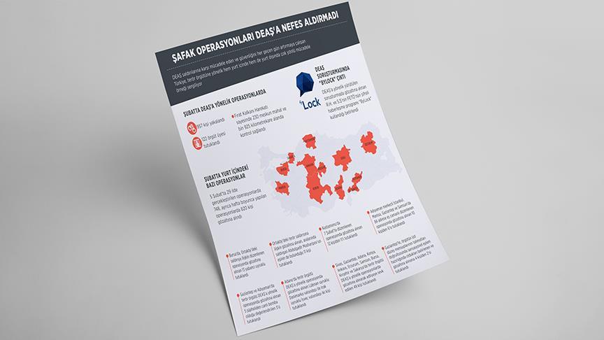 Terör örgütü DEAŞ'a yönelik operasyonlarına ülke içinde hız kesmeden devam eden polis, jandarma ve hudut birliklerinin yürüttüğü operasyonlarda örgüte ait çok sayıda doküman, silah ve mühimmat ele geçirildi. Ayrıca, Suriye sınırından teröristlerin geçişini engellemek için de önemli çalışmalar yürütüldü.