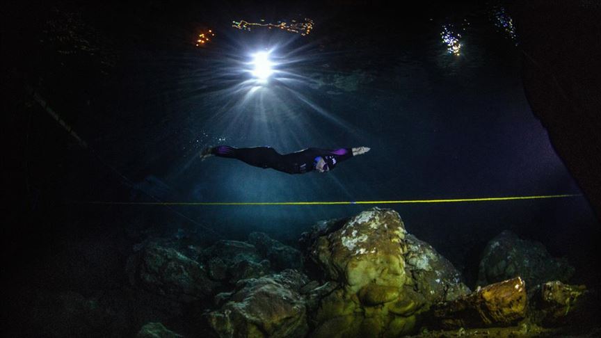 Dünya dalış rekortmeni milli sporcu Şahika Ercümen, rekor denemesinde bulunacağı Mersin'in Aydıncık ilçesindeki Gilindire Mağarası'nda antrenman gerçekleştirdi. ( Şebnem Coşkun - Anadolu Ajansı )