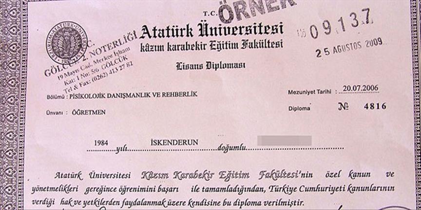 Kocaeli Valiliğinden yapılan yazılı açıklamada, Gölcük'te faaliyet gösteren özel bir kurumunda rehber öğretmen olarak 2009'dan beri görev yapan İ.K'nin diplomasının sahte olduğuna dair Gölcük Kaymakamlığına elektronik postayla ihbarda bulunulduğu belirtildi.