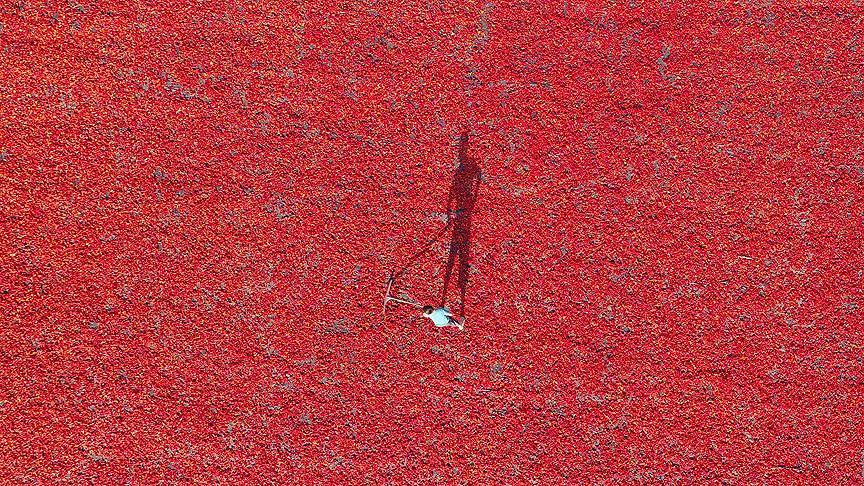 Kavurucu sıcağın üzerine acı da eklenince çalışanları bir hayli yoran biberler, elle parçalandıktan sonra makineden geçirilip naylonların üzerinde bir süre bekletiliyor.