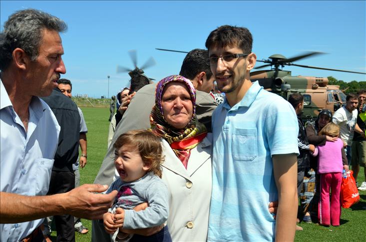 Sevcan Ünlü de kucağındaki çocuğuyla birlikte helikopterden inerek statta bekleyen yakınlarıyla kucaklaştı.
