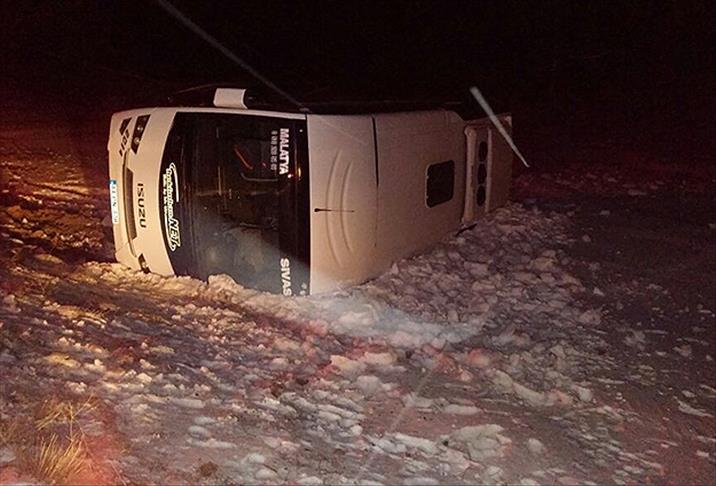 Alınan bilgiye göre, Sivas'tan Malatya'ya giden Kemal Buğday idaresindeki 44 PN 328 plakalı yolcu midibüsü, Malatya il sınırına 200 metre kala buzlanma nedeniyle kayarak yan devrildi.
