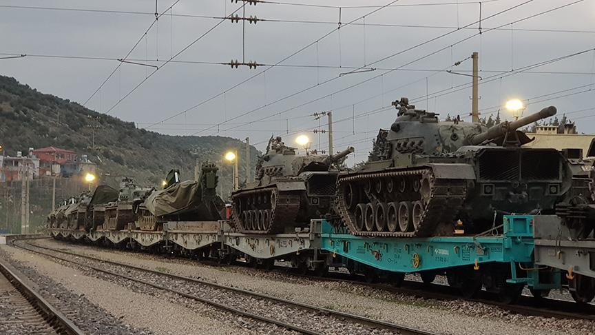 Derince'den 19 vagona yüklenen Kayar Köprücü Tankları, mayın patlatma tankları ve diğer askeri araçlar, İslahiye ilçesindeki Fevzipaşa Garı'na geldi.