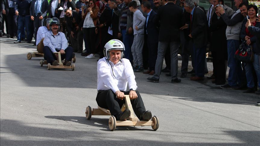 Belediye çalışanlarınca üretilen tahta arabalarla düzenlenen yarışta, beşer kişiden oluşan gruplar 200 metrelik parkurda mücadele etti.