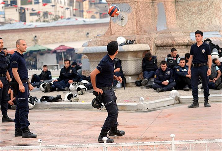 Bir grup polis, Taksim Cumhuriyet Anıtı çevresinde top oynayarak, hareketli geçen gecenin stresini atmaya çalıştı.