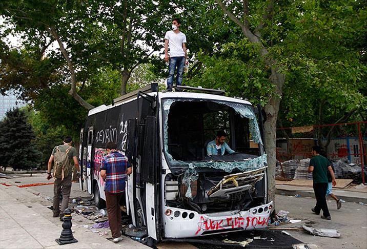 Yer yer kaldırım taşlarının ve trafik levhalarının söküldüğü, çöp konteynerlerinin, belediye otobüslerinin, polis ve basın araçlarının yakılarak tahrip edildiği Taksim Meydanı ve çevresinde, temizlik ekipleri çöp yığınlarını topluyor.