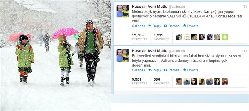 Mutlu'nun bu tweetini, 13 binden fazla kişi retweet etti, bin 300 kişi de favorilerine ekledi. Mutlu, öğrencilere bir günlük tatili ders çalışarak geçirmeleri tavsiyesinde de bulundu. Vali Mutlu'ya, ''vali amca'' ifadesinin yer aldığı 20 binden fazla tweet atıldı.