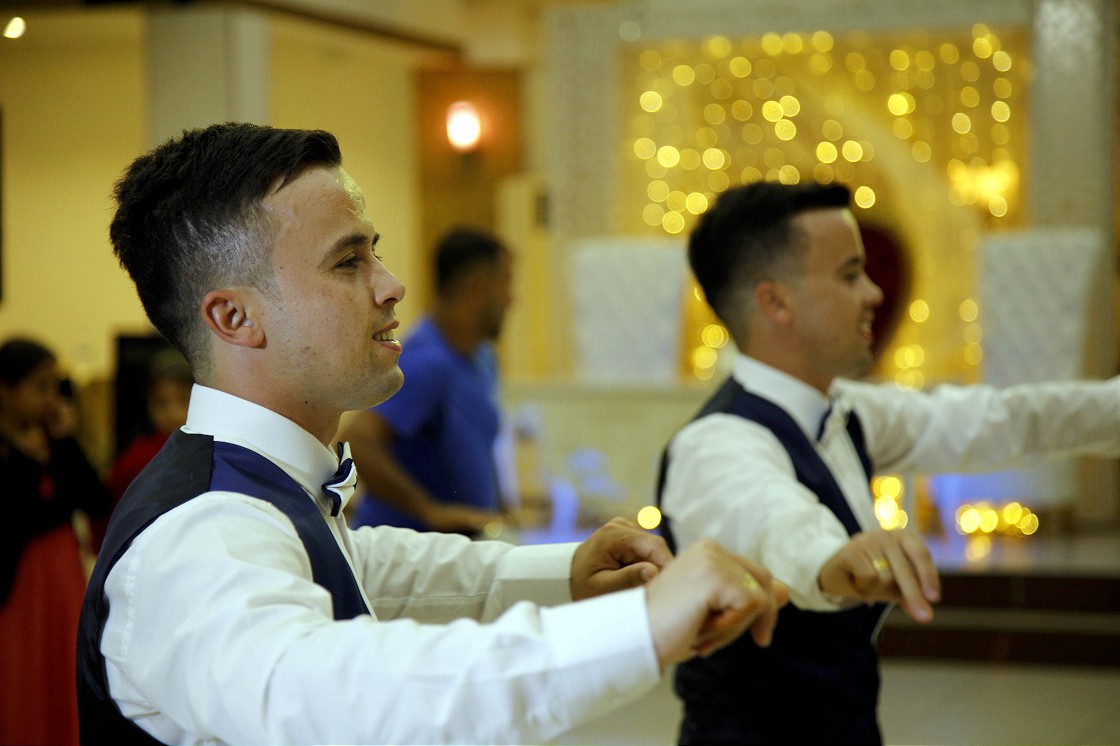 Aynı düğün salonunda çifte düğün merasimi gerçekleştiren erkek kardeşler aynı renk damatlığı kız kardeşler de aynı model gelinliği giydi.