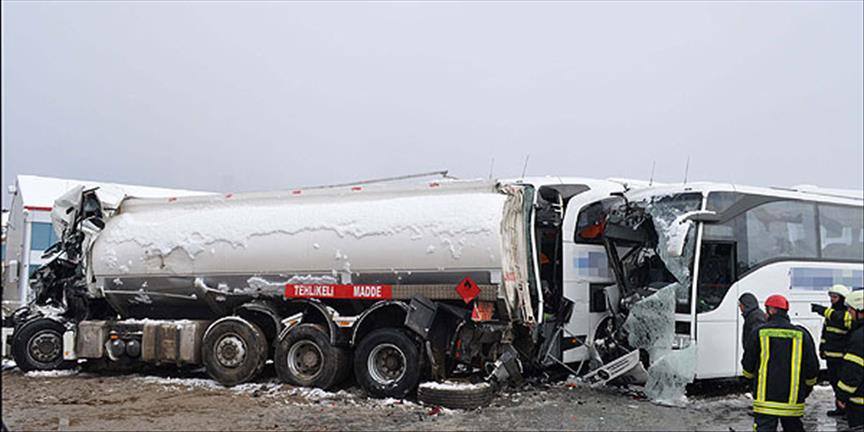 Alınan bilgiye göre, TEM Otoyolu'nun Tütünçiftlik Mahallesi mevkisinde, İstanbul yönünde giden, sürücülerinin kimlikleri henüz belirlenemeyen 28 AN 728 plakalı yolcu otobüsü ile 16 KK 815 plakalı yolcu otobüsü, mazot yüklü tanker ve otomobil, yoğun kar yağışı ve buzlanma nedeniyle çarpıştı.