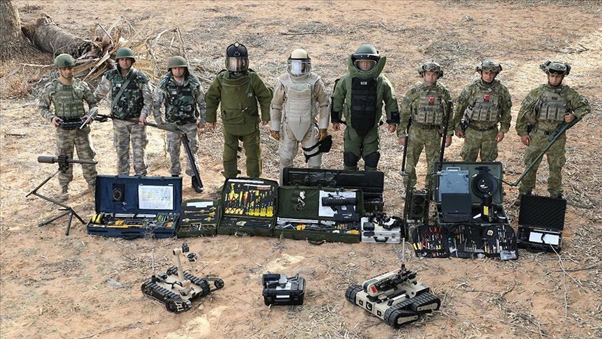 "Kara Kuvvetlerimizin mayın, el yapımı patlayıcı tespit ve imha (METİ) ile patlayıcı madde keşif ve imha (PMKİ) timleri, Ermenistan işgalinden kurtarılan bölgelerde kardeş Azerbaycan ordusuna destek sağlamaya başladı. METİ ve PMKİ timlerimiz hem mayın/EYP temizliği yapacak hem de Azerbaycan birliklerine eğitimler verecek."