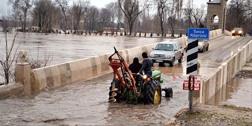 Tunca Nehri'nde seviyesi yükselen su, Tunca Köprüsü'nün gözlerinin büyük bölümünü kapattı. Bombeli yapısı nedeniyle çukurda olan bölümleri su altında kalan köprünün giriş ve çıkış bölümlerinde de su birikintileri oluştu.