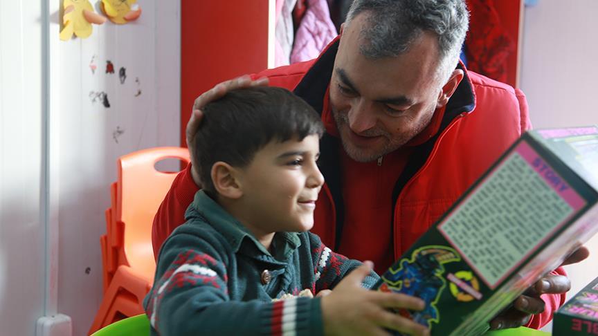 Boynuyoğun Geçici Barınma Merkezi'ndeki çocukları ziyaret ederek çeşitli oyuncaklar dağıtan Türk Kızılayı yetkilileri, merkezdeki Kızılay Çocuk Dostu Alanı'nda yetimlerin yaptıkları resimleri inceledi, çaldıkları bağlamayı dinledi.