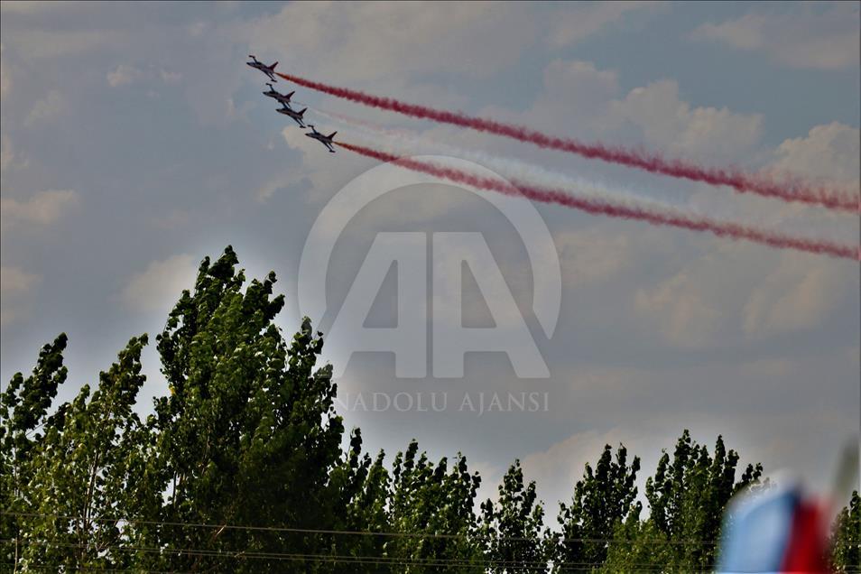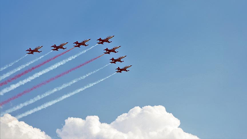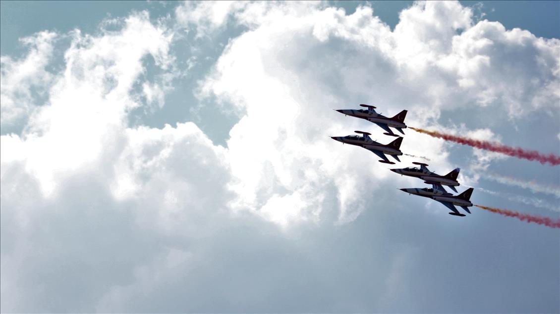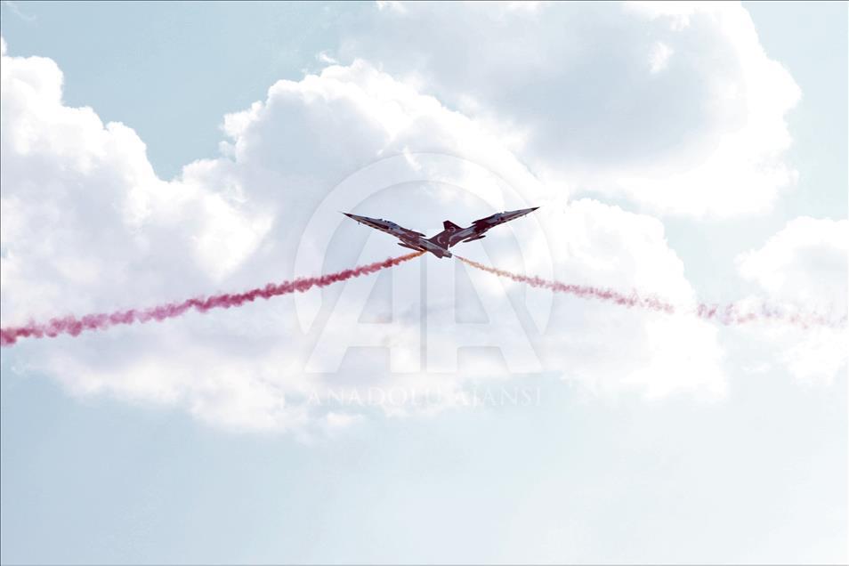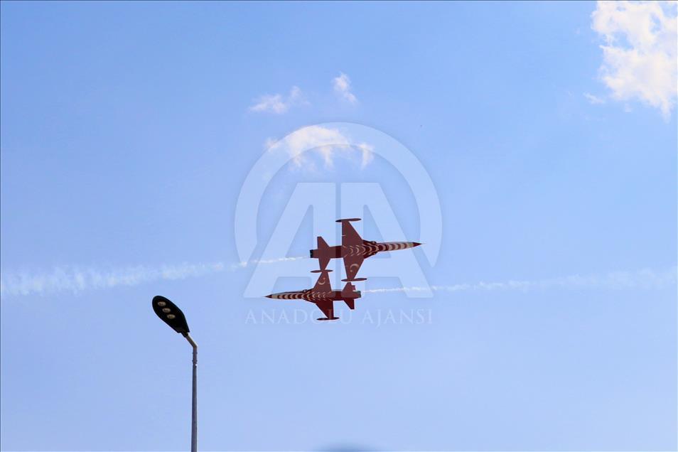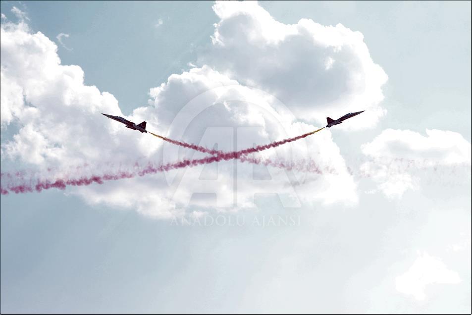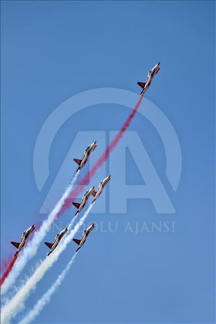 Türk Hava Kuvvetlerinin akrobasi timi Türk Yıldızları, "17. Yalvaç Pisidia Antiokheia Kültür Sanat ve Turizm Festivali" kapsamında Isparta'nın Yalvaç ilçesinde gösteri gerçekleştirdi. Yalvaç Otogarında düzenlenen etkinlik, Yalvaç Belediyesi mehter takımının gösterisiyle başladı. Otogar ve çevresindeki tepeleri dolduran vatandaşlar Türk Yıldızları'nın gösterisini ilgiyle izledi. Gökyüzünde çeşitli hareketlerle izleyicilerden beğeni alan gösteri yaklaşık 20 dakika sürdü. ( Mustafa Ünal Uysal - Anadolu Ajansı )