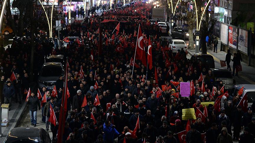 Ellerinde Türk bayrakları ve dövizlerle Gaziosmanpaşa Bulvarı'ndaki Ali Paşa Camisi'ne doğru yürüyen vatandaşlar, "Polise uzanan eller kırılsın" ve "Şehitler ölmez vatan bölünmez" şeklinde slogan attı.