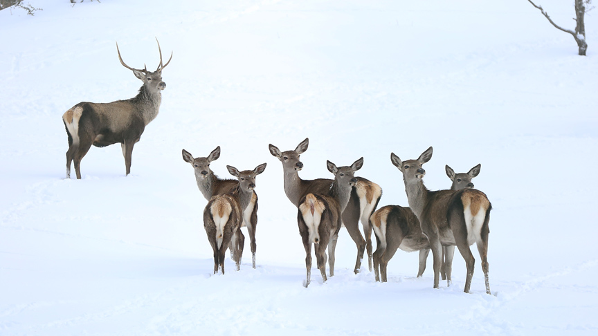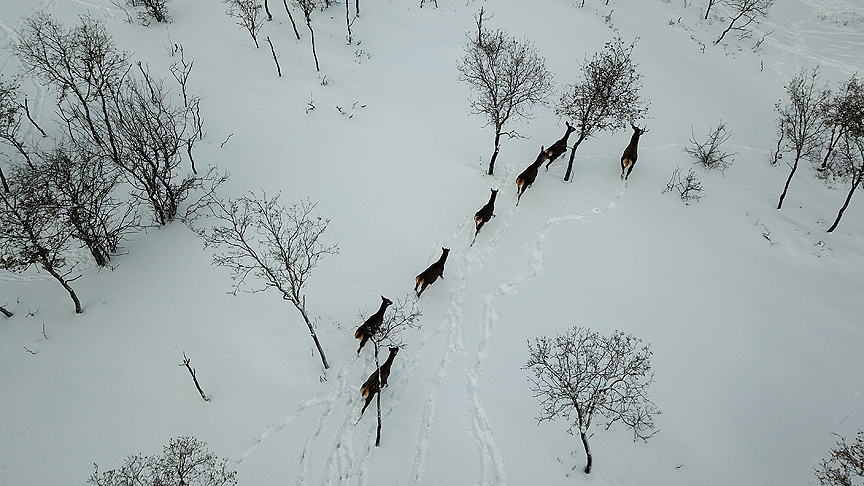 Beslenme ihtiyaçları Çorum Belediyesi ile Orman İşletme Müdürlüğünce karşılanan hayvanlar, doğal ortamlarında drone ile havadan görüntülendi. Gruplar halinde gezen hayvanlar, karla kaplı alanda güzel görüntüler oluşturdu.