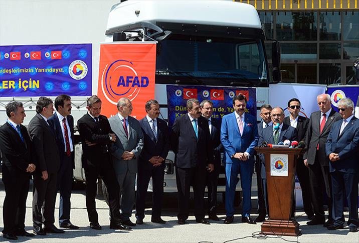 Türkiye Odalar ve Borsalar Birliğince (TOBB) Başbakanlık Afet ve Acil Durum Yönetimi Başkanlığı (AFAD) koordinasyonuyla Gazzeliler ve Irak'taki Türkmenlere gıda malzemesi yüklü 25 tır gönderilmesi dolayısıyla, TOBB Ekonomi ve Teknoloji Üniversitesi önünde tören düzenlendi.