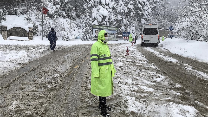 Jandarma ekipleri, zirve bölgesine gitmek isteyen sürücülerin araçlarında zincir bulunup bulunmadığını denetliyor. Ayrıca, yeni tip koronavirüs (Kovid-19) tedbirleri kapsamında uygulanan kısıtlama nedeniyle belge kontrolü yapılıyor.