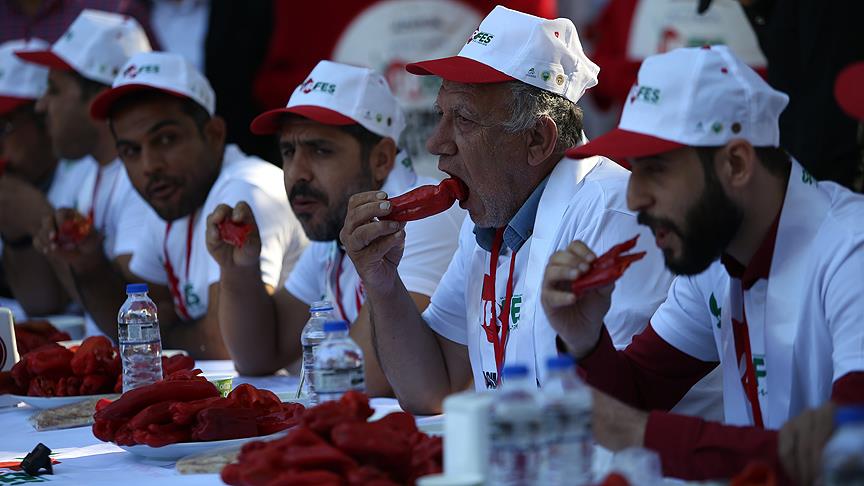 Hamarat Eller Çarşısı'nda yapılan etkinliğe katılan, aralarında kadınların da bulunduğu 40 yarışmacı, 5 dakikada en fazla biberi yiyebilmek için çaba gösterdi. Katılımcıların acıdan daha az etkilenmesi için ayran, yoğurt, su ve ekmek tüketmelerine izin verilen yarışmada, ilginç anlar yaşandı.