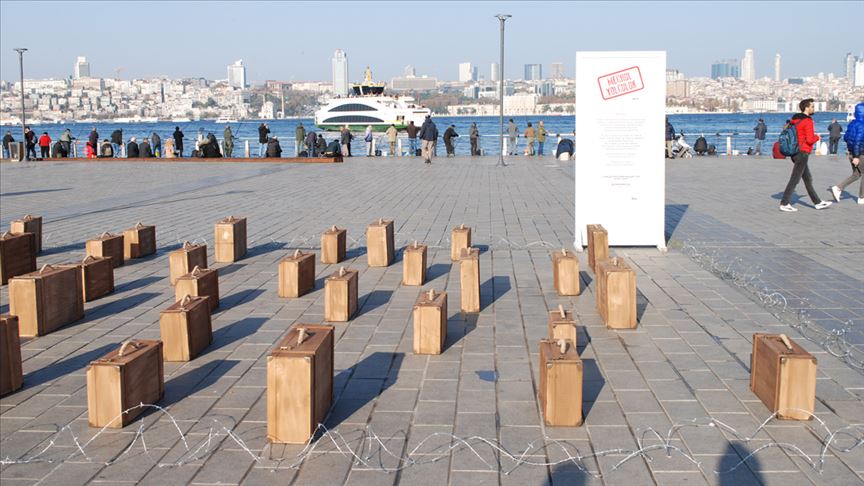 Üsküdar Meydanında düzenlenen etkinlikte, savaş ve diğer nedenlerden dolayı ülkelerini terk etmek zorunda kalan insanların valizleri, temsili olarak tel örgüler içerisinde sergilendi.