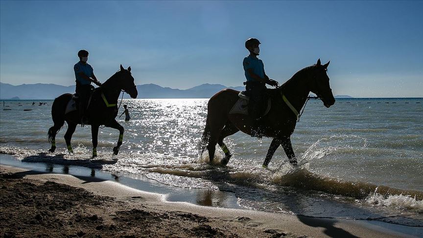 Yeni tip koronavirüs (Kovid-19) tedbirleri kapsamında vatandaşları sosyal mesafe konusunda da uyaran atlı jandarmalar, motorlu araçların giremediği Van Gölü'nün sahil bandı boyunca halkın huzur ve güvenliğinin sağlanması amacıyla devriye geziyor.