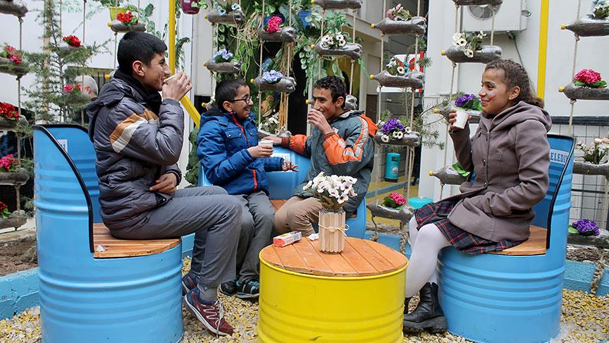 Atık malzemeleri yeniden tasarlayarak köpek barınağı, kitaplık, koltuk, çiçeklik, süs eşyalarına dönüştürerek boyayan belediye ekipleri, sokaktaki duvarlara da 50 bin plastik kapak yapıştırarak üzerlerine dünyaca ünlü ressamların eserlerini yansıttı.