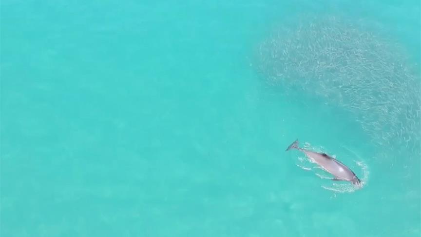 Kıyıya yakın bir noktada iki yunusun balık sürüsünü kovaladığını fark eden Yurttaş, nadir görüntülenebilecek olayı havadan kayıt altına almayı başardı.