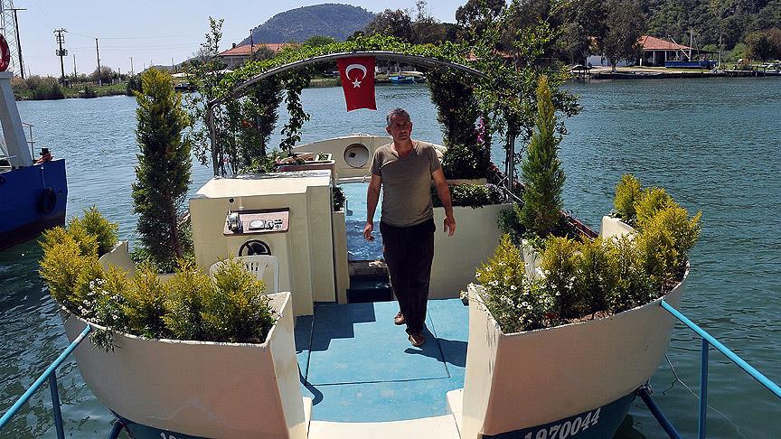 12 metrelik teknenin güvertesine yaptırdığı saksılara 25 çeşit çiçek, sarmaşık ve ağaç diktiğini belirten Yalılı, teknenin iki yılda tamamlandığını anlattı.