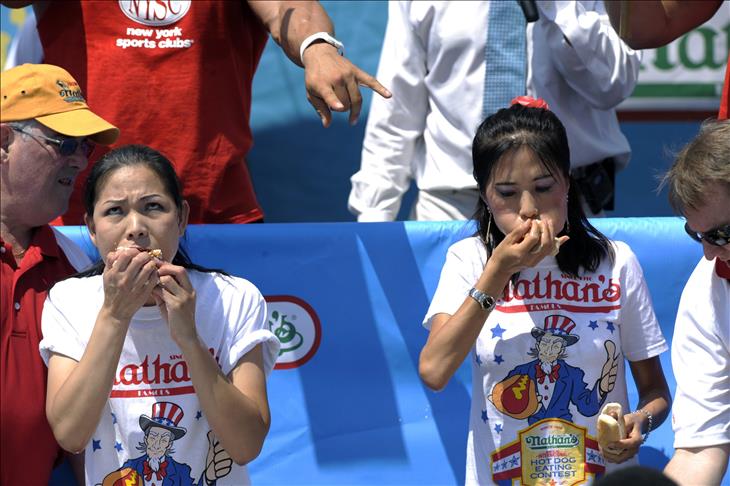 Kore asıllı, 44 yaşındaki Sonya Thomas (solda) dün New York Coney Adası eğlence parkında yapılan geleneksel sosisli sandviç yarışmasını 10 dakikada 45 sosisli sandviç yiyerek kazandı. Kilo başına bir sandviç yiyen Thomas, 13 rakibini geride bıraktı.