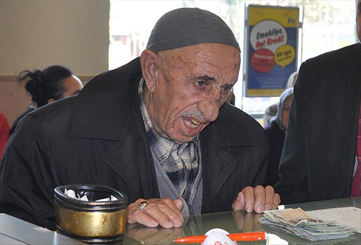 İstanbul, Bursa ile Siirt'te dönüşümlü olarak çocuklarının yanında yaşayan ve 3 bin 600 günü tamamlayarak emekliliğe hak kazanan 1 Ocak 1908 Siirt doğumlu İbrahim Eren, İstanbul'dan Bursa'ya oğlu Hüsnü Eren ile ilk emekli maaşını almaya geldi.