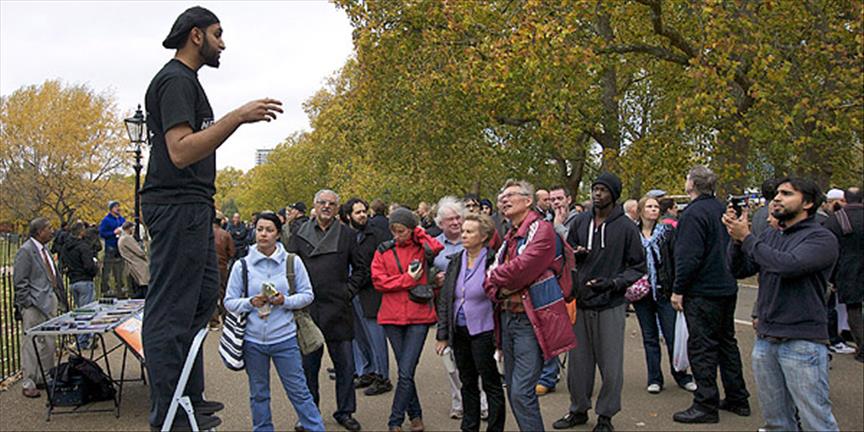 Londra'nın en büyük parkını ziyaret eden çok sayıda kişinin ve turistin dikkatinden kaçmayan bu köşede, politikadan dine, sanattan teknolojiye kadar her konuda fikirlerini açıkça ortaya koyan insanlara rastlanıyor.