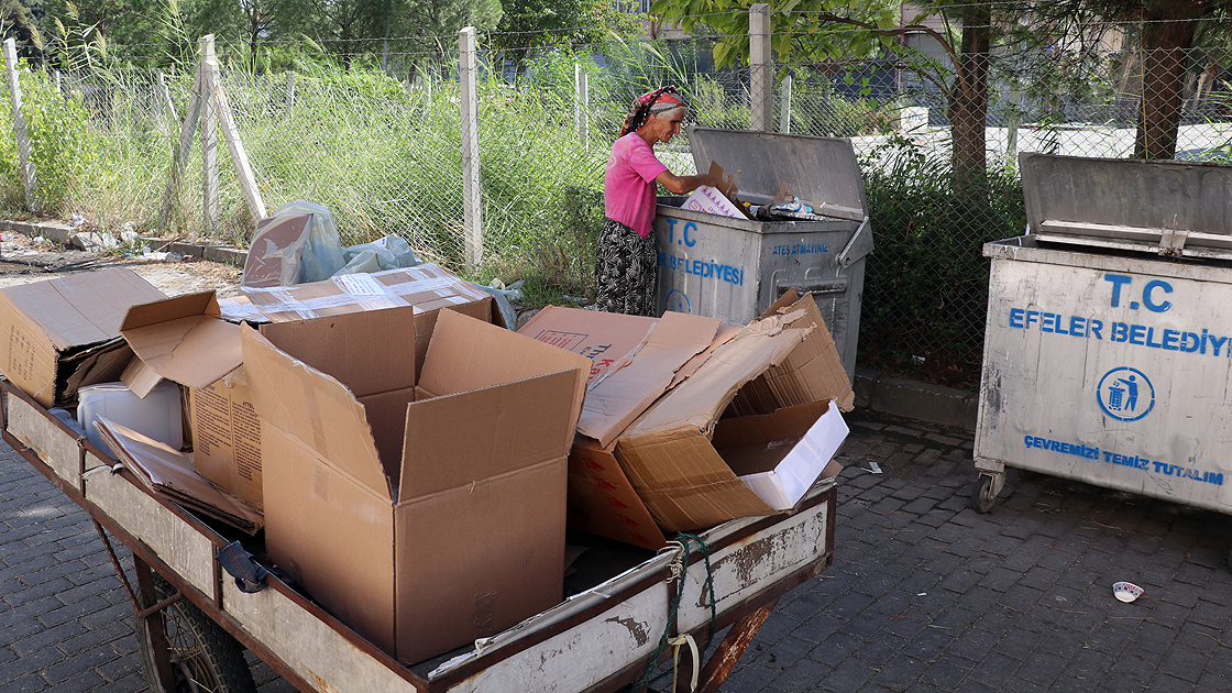 Aydın'da yaşayan 75 yaşındaki Ayşe Güymen, ilerleyen yaşına rağmen sokak sokak dolaşıp topladığı kartonları satarak evinin geçimini sağlıyor.